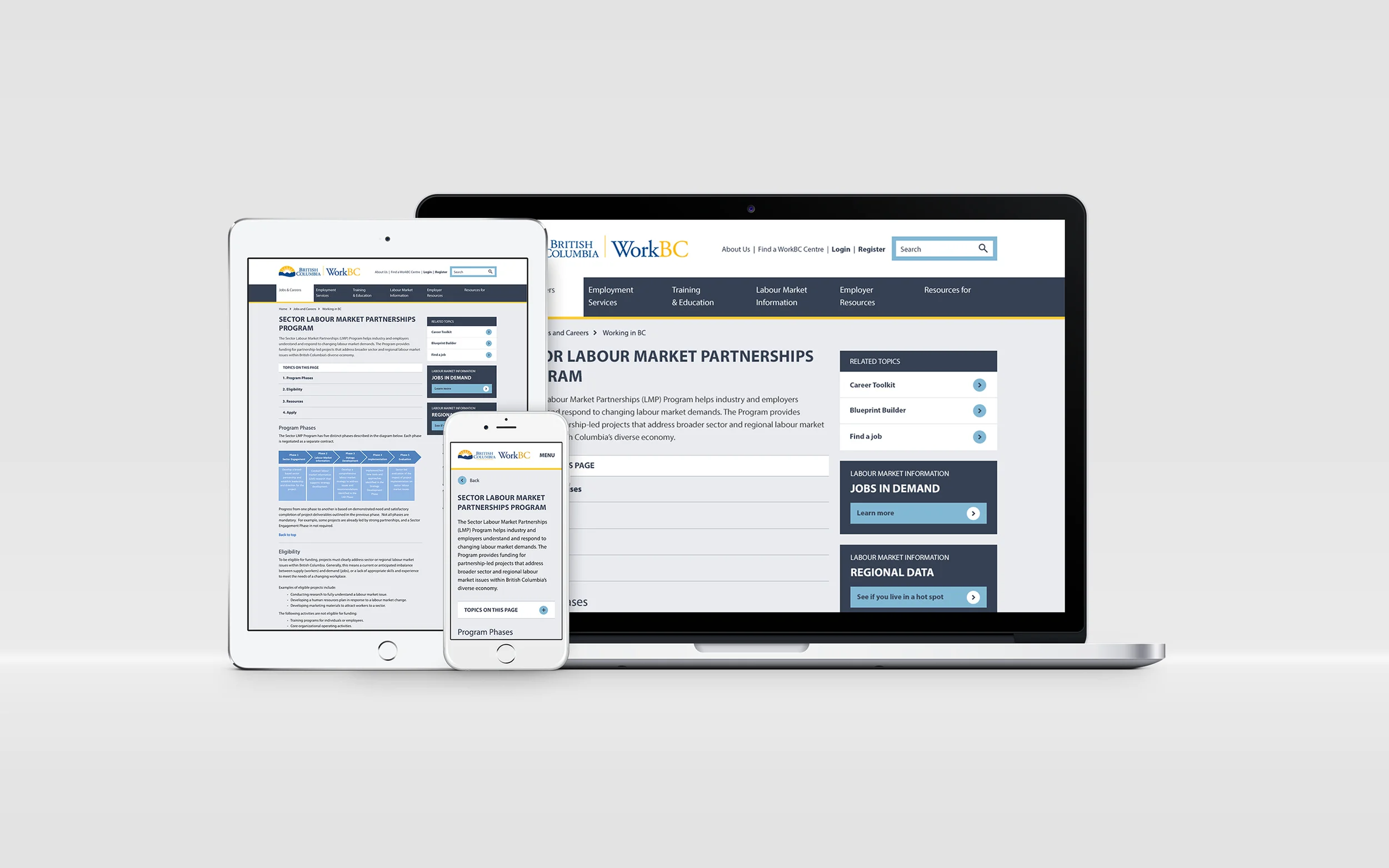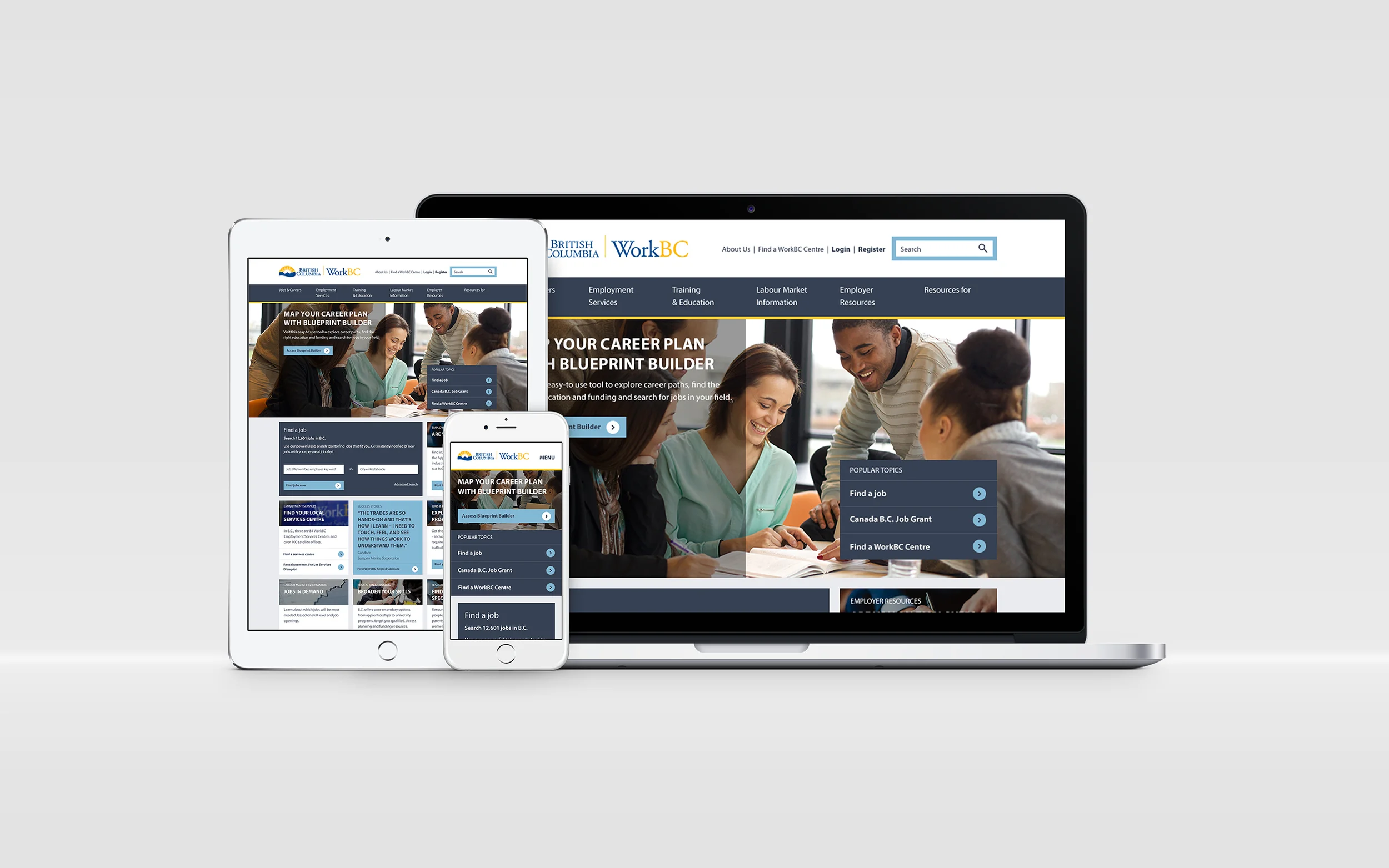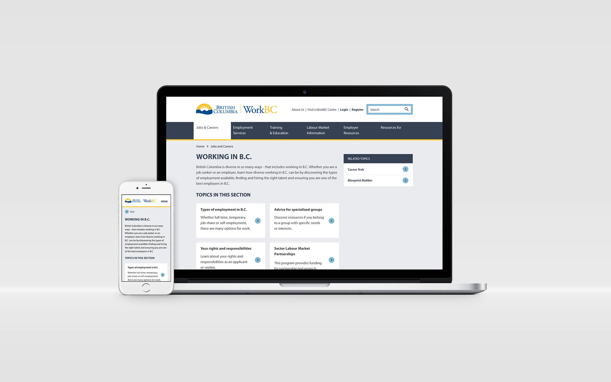British Columbia’s Ministry of Jobs, Tourism and Skills Training created WorkBC to help users navigate B.C.’s labour market. The site is a one stop shop for job seekers both young and old and although it went through a very successful redesign a few years back, the client wanted some additional improvements made to the site to help users access the full array of resources they offer. Working in close collaboration with the UX lead, using a modular based design approach, we created a series of flexible templates for use throughout the site.